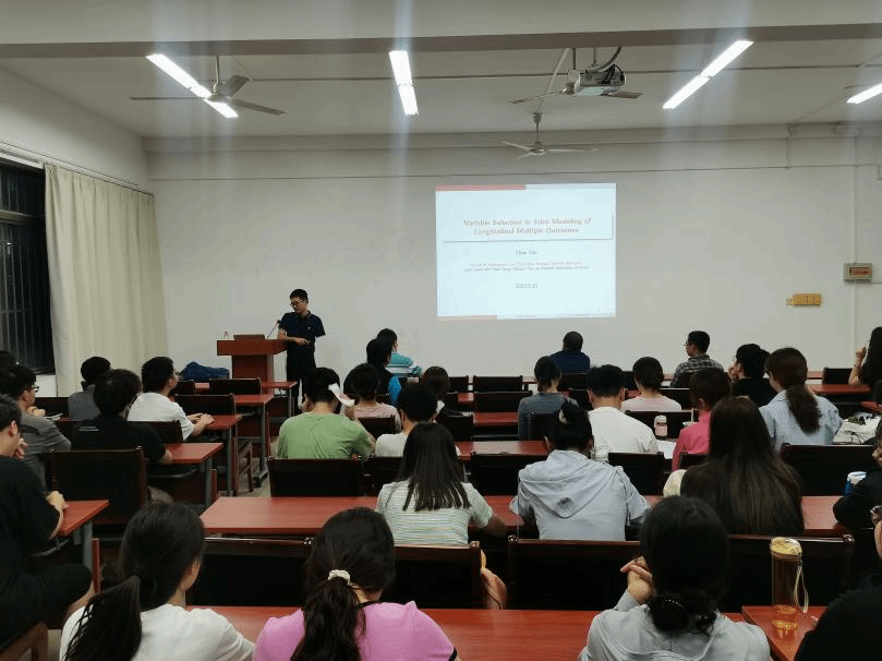 5月15日为了提升我院研究生的科研能力,扩展研究生的学术视野,我院邀请广西师范大学数学与统计学院晏振博士来我院作题为《Variable Selection in Joint Modeling ofLongitudinal Multiple Outcomes》的学术报告。本次报告会由霍海峰副院长主持,学院统计系部分老师老师和研究生共七十余人参加。