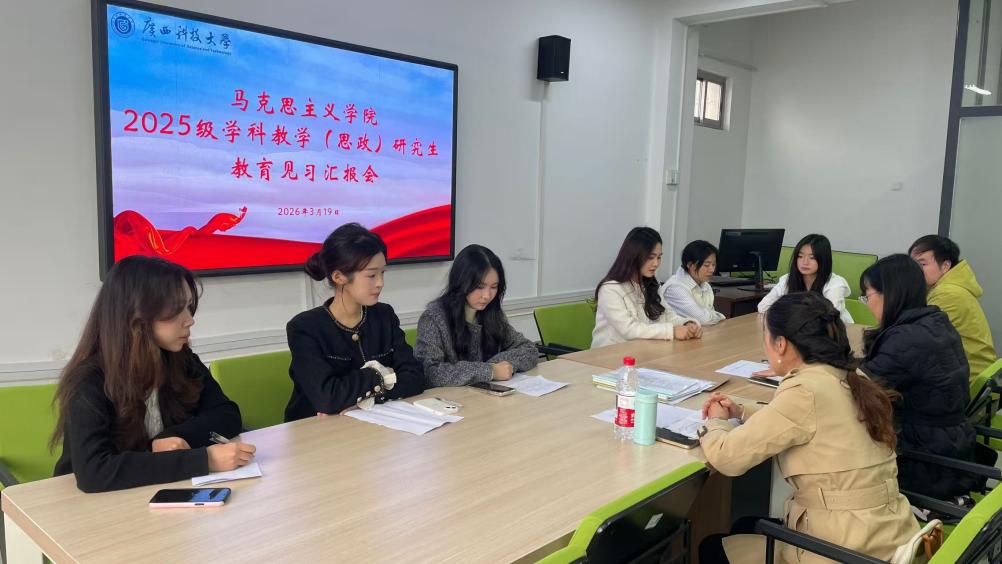 为巩固教育见习实践成果,交流思政教学实践感悟,提升学科教学(思政)专业研究生的教学实践能力与育人素养,3月19日下午,马克思主义学院学科教学(思政)专业教育见习汇报会圆满开展。广西科技大学教师发展中心副主任武博教授、马克思主义学院学科教学(思政)专业负责人赵芸教授出席本次汇报会,学科教学(思政)专业全体见习研究生参与汇报分享,汇报会由研究生张佳怡主持。