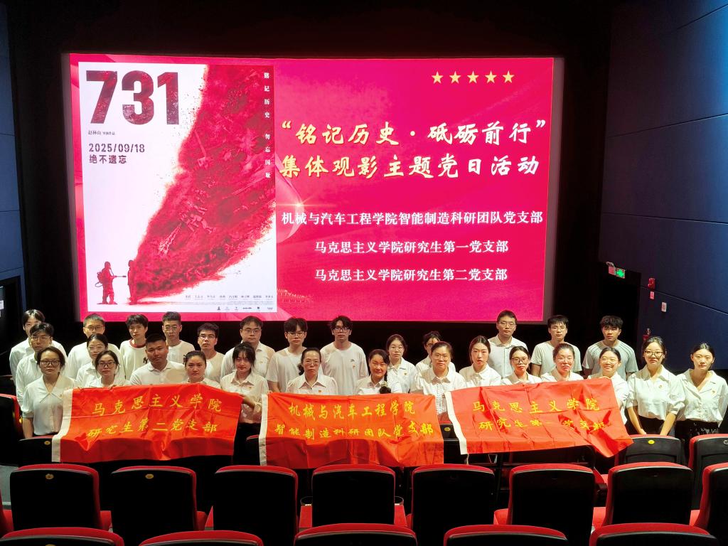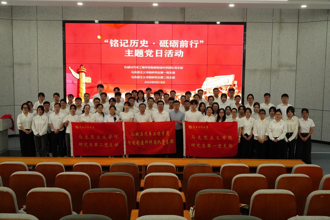 9月18日,马克思主义学院研究生党支部联合机械与汽车工程学院智能制造科研团队党支部开展“铭记历史 砥砺前行”主题党日活动。马克思主义学院党委副书记、院长冯丕红,机械与汽车工程学院党委副书记、院长孙有平,学校党委组织部副部长陆雨薇,马克思主义学院党委副书记、纪委书记夏辛萍,马克思主义学院副院长张磊,机械与汽车工程学院智能制造科研团队党支部书记李冰,马克思主义学院研究生第二党支部书记江芸玲以及,支部全体党员共同参加了本次活动。