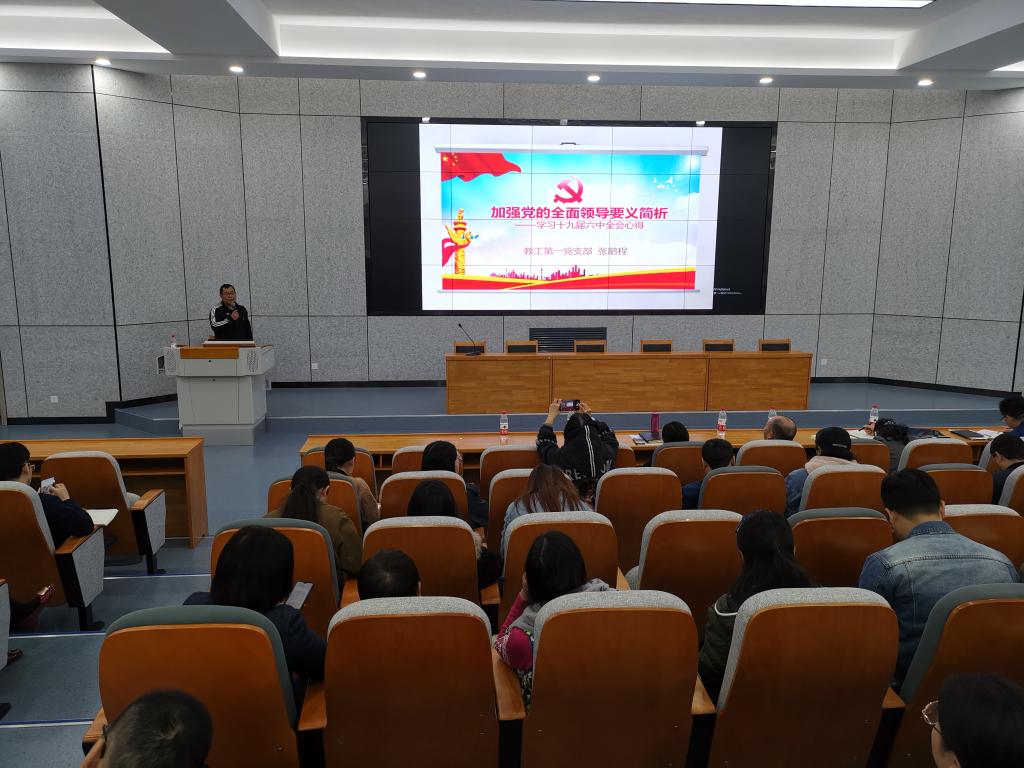 接着,学院教工第一党支部书记张鹏程以《加强党的全面领导要义简析》为题,分享了学习十九届六中全会精神的心得。他从加强党的全面领导的背景、历史选择和现实要求三个方面讲述全党必须铭记生于忧患、死于安乐,常怀远虑、居安思危,继续推进新时代党的建设新的伟大工程,坚持全面从严治党,坚定不移推进党风廉政建设和反腐败斗争,做到难不住、压不垮,推动中国特色社会主义事业航船劈波斩浪、一往无前。