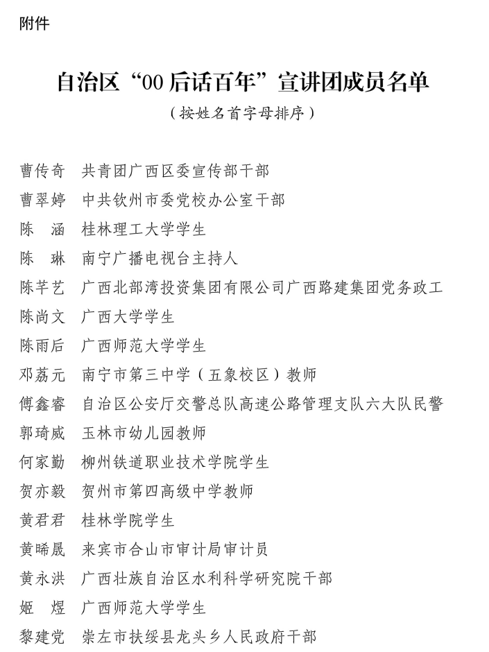 据悉,为深入学习宣传贯彻习近平新时代中国特色社会主义思想和党的二十大精神,深入贯彻落实习近平总书记关于青年工作的重要思想,培育担当民族复兴大任的时代新人,自治区党委宣传部、自治区党委讲师团在全区范围内组建“00后话百年”宣讲团并遴选成员。经逐级推荐、笔试、面试等环节,来自全区高等学校、机关单位、国有企业、社会各界等青年群体的50名优秀青年入选“00后话百年”宣讲团。