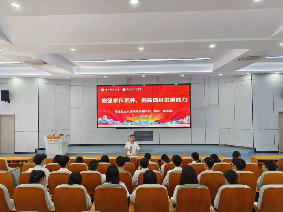 学院党委副书记、院长戚杰强为新生详细讲述了马克思主义理论学科起源、发展沿革和时代课题等内容。他指出,在社会加速进步与科技不断革新的背景下,强化学科素养已成为个人全面提升自我、增强发展能力的重中之重,而读原著、学原文、悟原理是提高马克思主义理论素养的必然要求。他勉励同学们要深入研读马克思主义原著,通过阅读鉴赏、表达积累和探究整合等途径,逐步培养马克思主义理论学科素养,不断提高自身发展能力,强化个人竞争力。