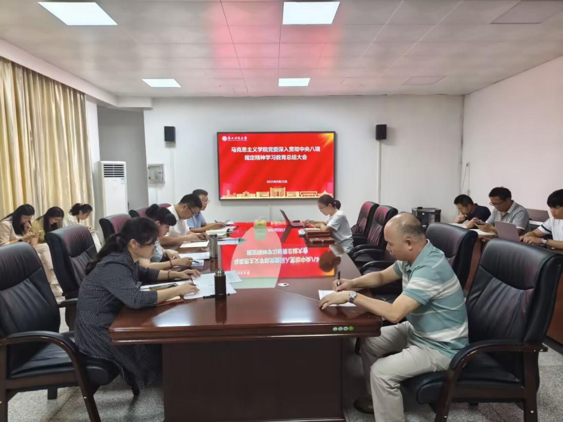 9月23日下午,马克思主义学院党委在文昌校区建工楼302会议室召开深入贯彻中央八项规定精神学习教育总结大会。全体教工党员、学生党员代表参会,会议由学院党委书记覃雪梅主持。