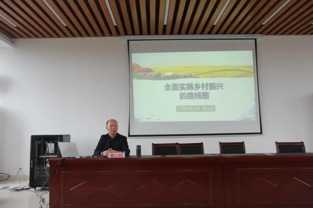 2021年4月11日,为进一步加强村级基层组织建设,增强新一届村级班子的战斗力和凝聚力,在柳州市城中区环江村委5楼会议室举办了城中区新一届村(社区)“两委”干部任职培训班(第三期)。广西科技大学马克思主义学院院长黄山松为学员作题为“全面实施乡村振兴战略的路线图”的专题培训报告。