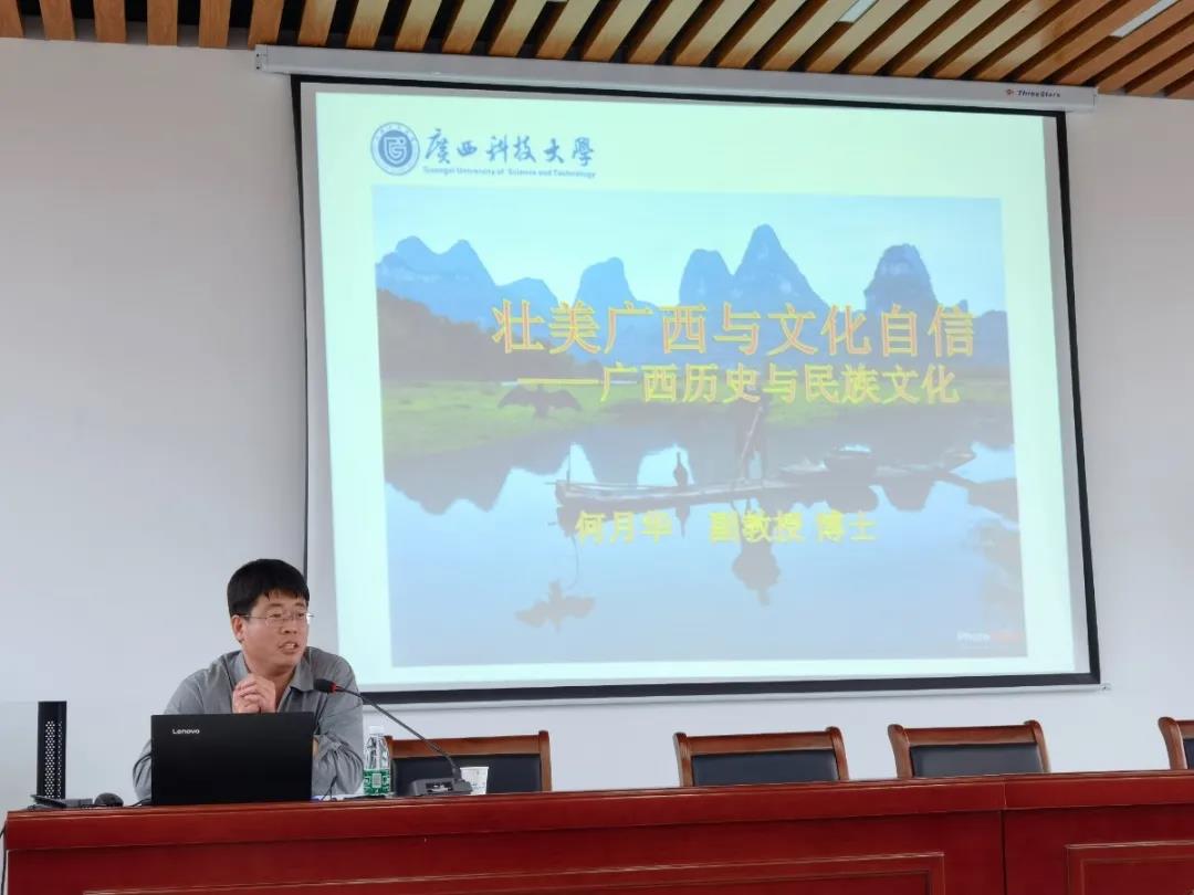 何月华博士从文化自觉入手,讲解广西历史与文化自信的底气源头。他认为建设壮美广西,一是文化产业要真正做到惠民乐民,让百姓共享文化服务;二是充分发挥我区文化资源优势,全面提升广西文化产业创新能力和核心竞争力,加快推进文化产业跨越式发展;三是扶持推进各地独具特色的地方文化产业项目。何月华表示,我们要充分利用广西“文化走出”的优势,积极践行广西“三大定位”新使命,步入建设壮美广西的历史新阶段,让八桂文化走向世界。