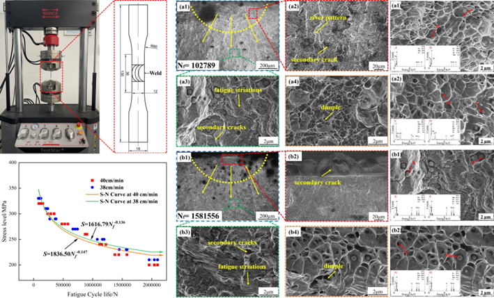 孙有平教授团队探究了焊接速度对焊接接头动态再结晶、晶粒尺寸、残余应力和第二相形成与演变规律的影响,建立了关于焊接速度的焊接接头疲劳寿命预测模型,定量化研究了焊接接头显微组织及第二相对焊接接头疲劳性能的影响。这一成果不仅丰富了高强度钢焊接工艺的理论基础,而且为工程机械高强度钢焊接结构件的性能预测提供了理论支持。