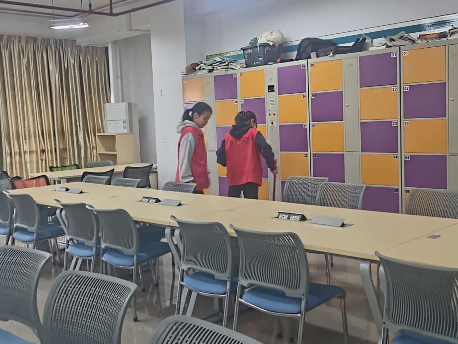 在校园环境提升方面,青协开展了教室专项清扫活动,40名志愿者自带清洁工具,分工协作对科教楼 1101、1108、1112、1118、1017 室5间教室开展全面清洁,重点完成地面清扫、桌面擦拭、黑板清洁、卫生死角除尘等工作,彻底清除教室杂物、笔迹与积灰,服务时长累计80小时,为师生打造干净整洁的教学空间和考研备考环境。
