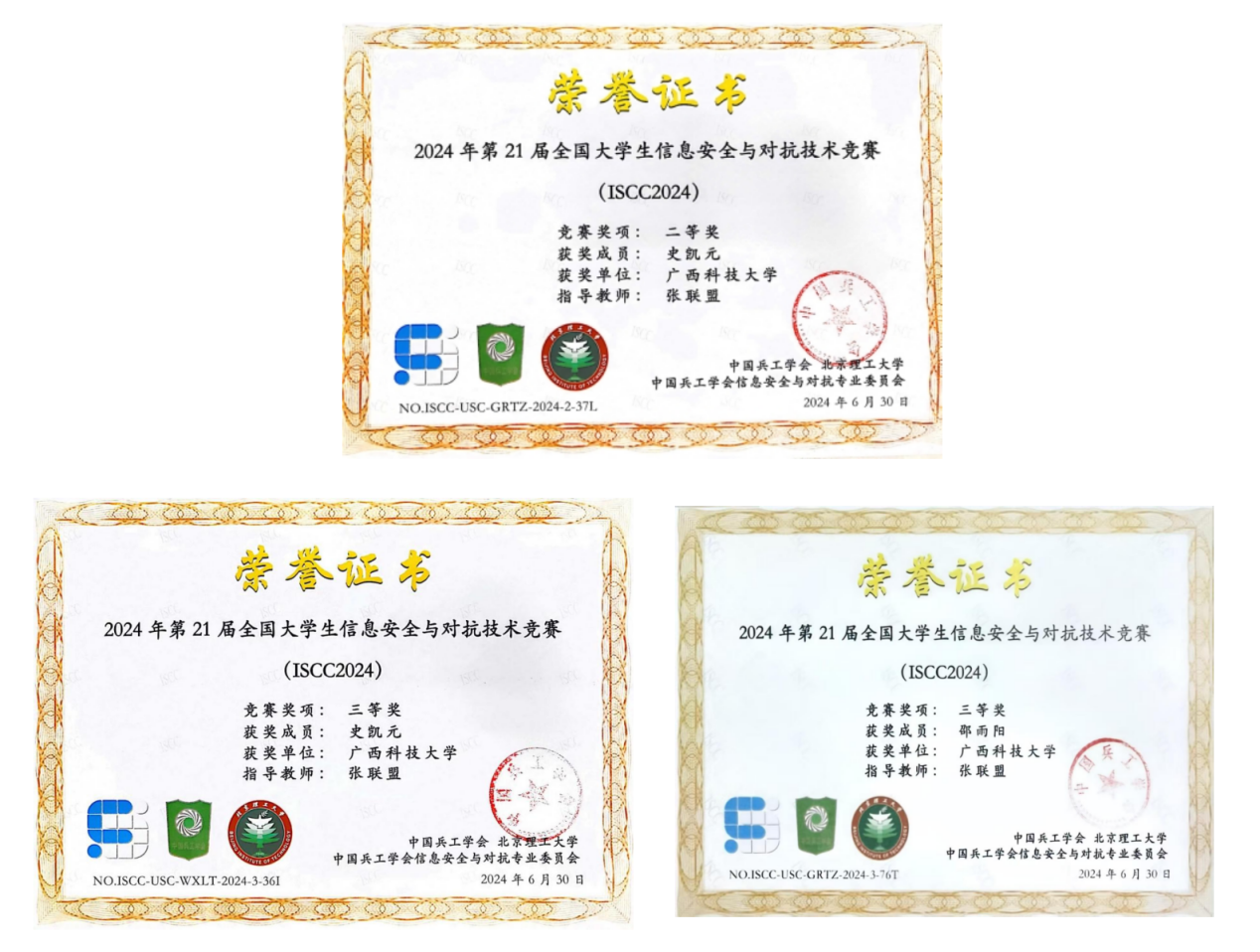 在全国大学生信息安全与对抗技术竞赛(ISCC)中,学院实现两年连获奖项: