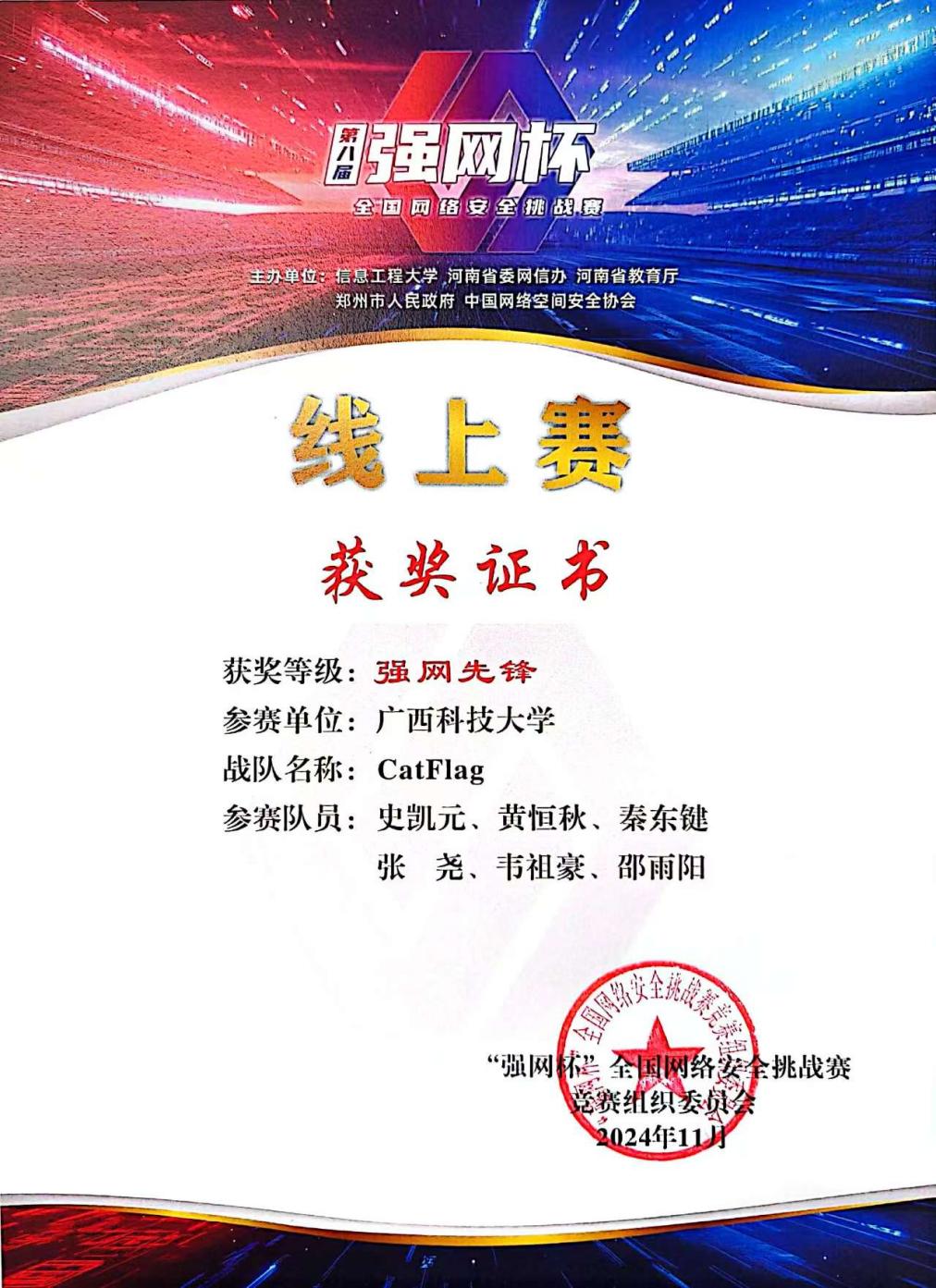 在由中国网络安全协会、河南网信办及河南省教育厅联合主办的第八届 “强网杯”全国网络安全挑战赛中,史凯元带领CatFlag 战队斩获 “强网先锋” 称号。作为国内网络安全领域颇具影响力的赛事,“强网杯”已成功举办八届,本届赛事汇聚全国众多顶尖队伍,竞争尤为激烈。