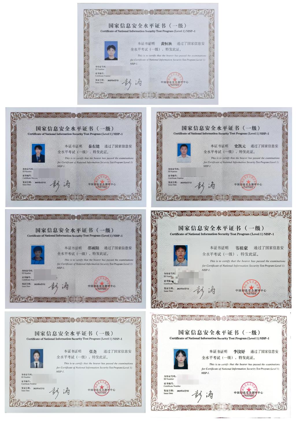 在第十八届全国大学生信息安全竞赛(创新实践能力赛)暨第二届“长城杯”铁人三项赛(防护赛)中,协会CatFlag队(史凯元、秦东键、黄恒秋、邵雨阳)和疯狂星期四你会V我50对不队(李汶妤、张尧、韦祖豪)两支队伍的7位同学晋级半决赛,均获得国家信息安全水平考试(NISP)一级证书。