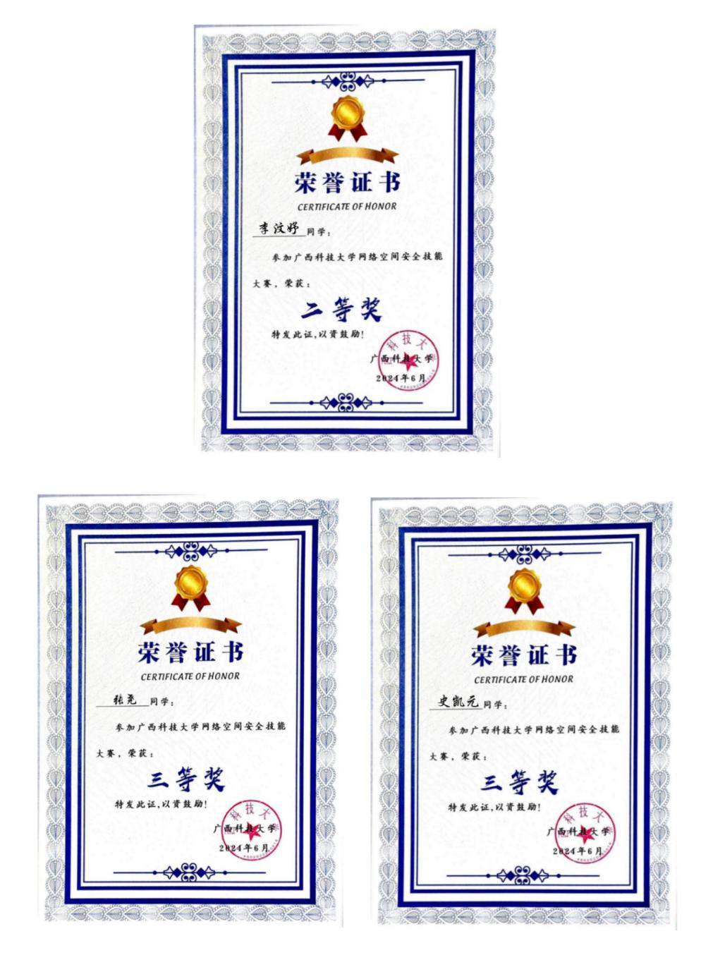 校内赛事方面,自2024年以来,“广西科技大学网络空间安全技能大赛”已连续举办两届,均由网络安全协会承办,逐步形成学院特色赛事品牌。两届比赛均聚焦网络安全基础知识和实战技能,旨在提升学生的专业应用能力和团队协作水平。协会成员在比赛中表现优异,首届赛事中李汶妤荣获二等奖,史凯元、张尧获三等奖。