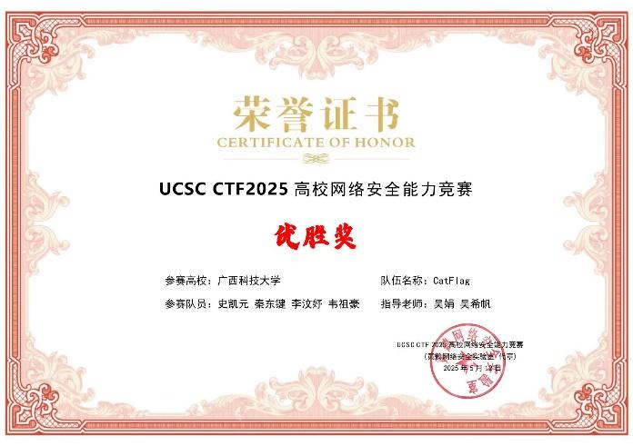 2025年4月,作为国内高校网络安全领域颇具影响力的赛事之一,由湖北大学、国际关系学院及黄鹤网络安全实验室联合主办的 UCSC CTF2025 高校网络安全能力竞赛吸引了全国 500余支高校战队同台竞技,赛事规模及竞争强度均处于较高水平。我校CatFlag战队由史凯元、秦东键、李汶妤、韦祖豪四名学生组成,在吴娟、吴希帆两位指导教师的精心指导下,获第61名,斩获优胜奖。