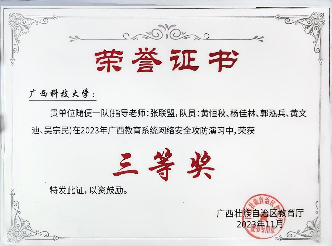 省级赛事同样传来捷报。2023 年广西教育系统网络安全攻防演习作为省级重要网安实战演练,聚焦实战能力比拼,对团队的漏洞防御、应急响应等综合能力提出高要求。由会长黄恒秋带领的随便一队(队员:黄恒秋、杨佳林、郭泓兵、黄文迪、吴宗民),在网安教研室主任张联盟老师的指导下,从漏洞排查到防御部署连续一周高强度投入,最终荣获自治区三等奖。