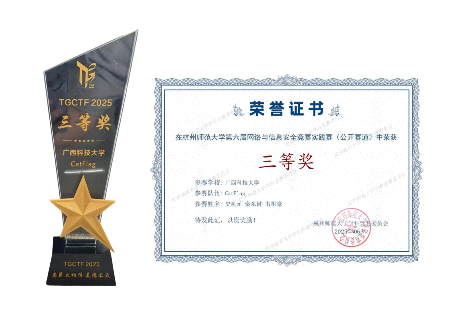 2025年4月,杭州师范大学第六届网络与信息安全竞赛实践赛(公开赛道) 落下帷幕。本次赛事规格高、竞争激烈,公开赛道吸引复旦大学、武汉大学、华中科技大学等全国 392 所高校,及近 500 个企业、中学、联合战队等社会组织参与,超千支队伍。我校由史凯元、秦东键、韦祖豪组成的CatFlag战队凭借过硬技术与协作能力,在全国1000余支参赛队伍中突围,获第28名,荣获公开赛道三等奖 。