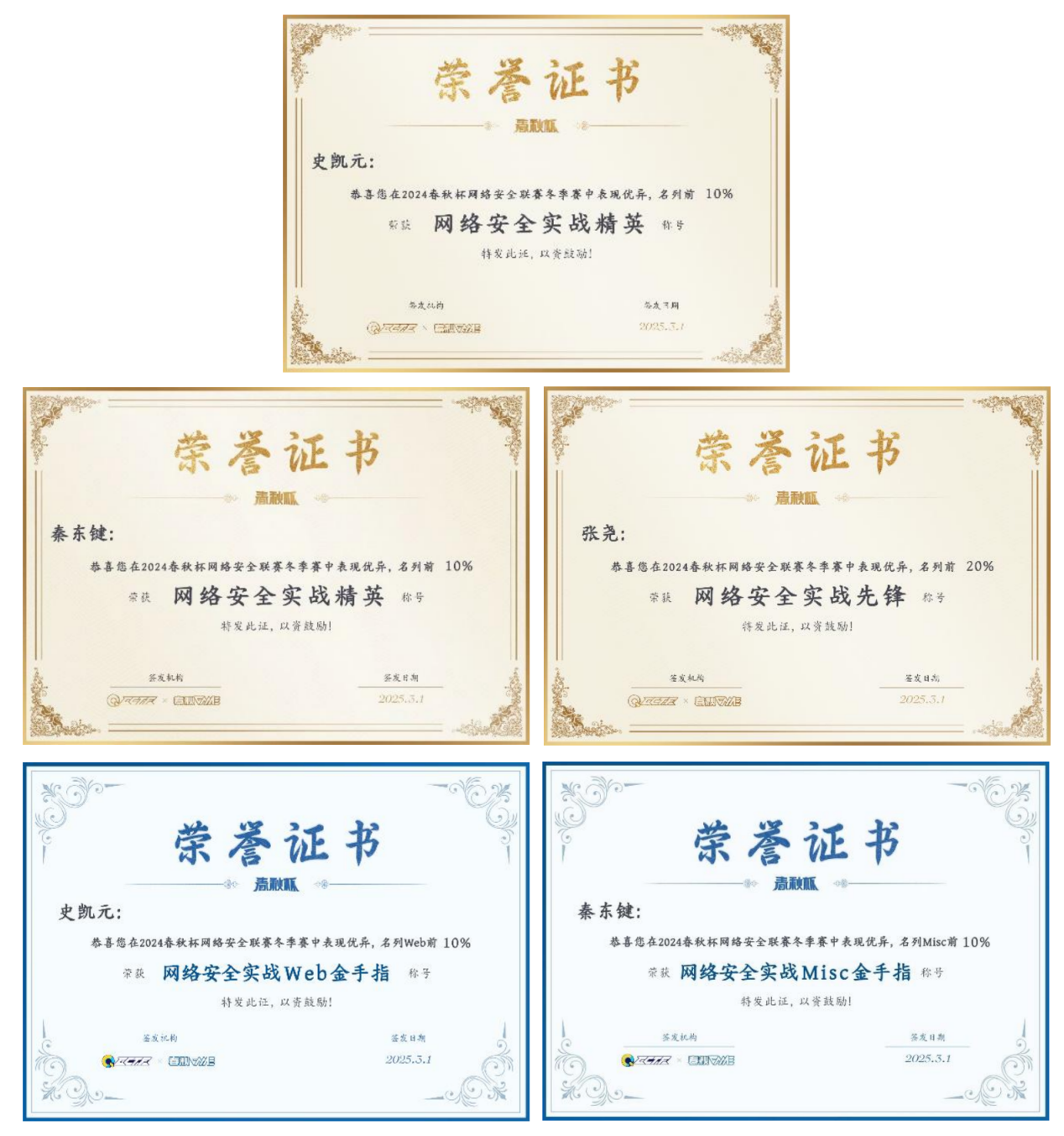 2025年1月,在由中国网络空间安全人才教育联盟携手永信至诚科技集团股份有限公司举办的春秋杯网络安全联赛冬季赛中,我院史凯元、秦东键、张尧三位同学与来自全国各地高校(中国人民公安大学、中国人民大学、四川大学、暨南大学、湖北大学等)和社会各界网络安全爱好者(极安智信(成都)科技有限公司、黄豆网络安全实验室、中国联合通信有限公司软件研究院等)共计1500多支队伍同台竞技并脱颖而出,史凯元、秦东键分别取得了第29名和第61名的优异成绩,荣获“网络安全实战精英”称号,张尧同学位列前20%,荣获“网络安全实战先锋”称号。在单项方面,史凯元、秦东键表现突出,均斩获“网络安全实战 Misc 金手指”、“网络安全实战 Web 金手指”荣誉称号。