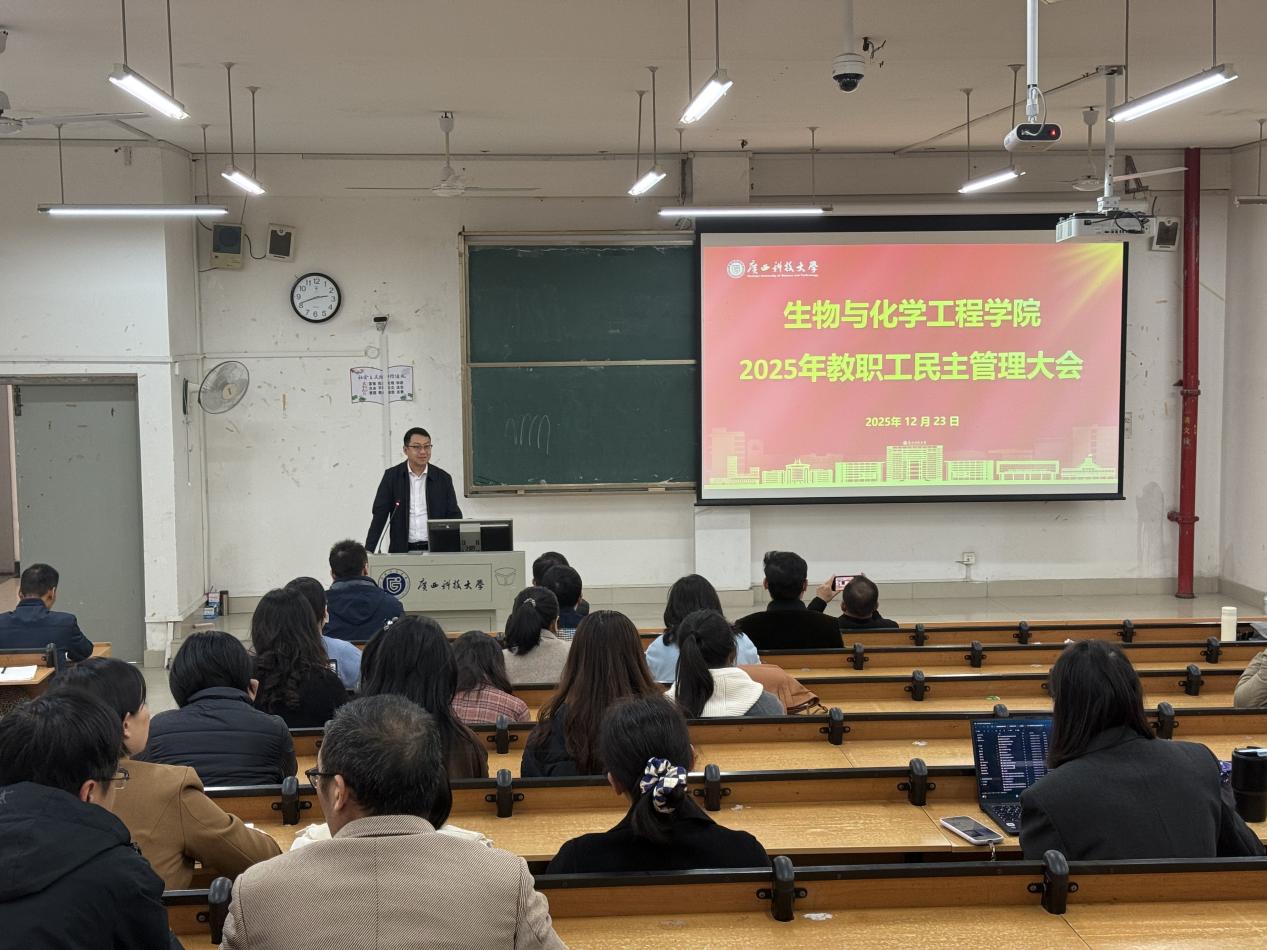 12月23日下午,生物与化学工程学院在柳石校区1-203召开2025年教职工民主管理大会,总结年度工作、深化民主管理、共谋学院发展。会议由学院党委副书记、纪委书记钟兴主持。会上,学院党委书记陈志波作年度工作报告。他对学院2025年度考核指标的完成情况进行了全面通报,系统总结了学院在过去一年中取得的阶段性成果,并对全体教职工的辛勤付出给予了充分肯定。学院党委副书记、院长文家燕就《生物与化学工程学院2025年绩效分配方案》进行了详细说明,重点阐述了方案的制定原则与核心内容,强调了方...