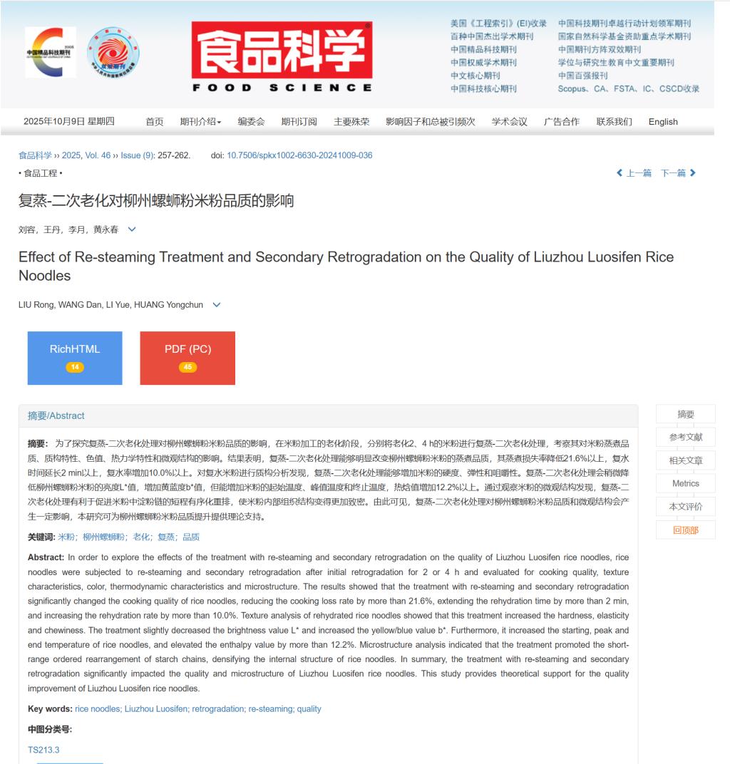 近期,生化学院“糖资源加工过程强化技术与装备团队”在国内外重要期刊发表柳州螺蛳粉(米粉)方面的研究成果。成果包括:(1)发表EI论文1篇:在国内食品领域最具影响力的期刊食品科学(EI收录)发表了《复蒸-二次老化对柳州螺蛳粉米粉品质的影响》,论文的第一作者为刘容副教授,通讯作者为广西柳州螺蛳粉技术创新中心主任黄永春教授;(2)发表SCI论文1篇:在国际食品领域重要期刊LWT- Food Sicence and Technology(中科院一区top期刊, IF=6.6)发表《Effects of short-term retrogradation behavior on the quality and structure of dry rice noodles》,研究生李月和王丹共同为论文第一作者,刘容副教授和黄永春教授为共同通讯作者。以上成果均以广西科技大学生物与化学工程学院为第一单位。