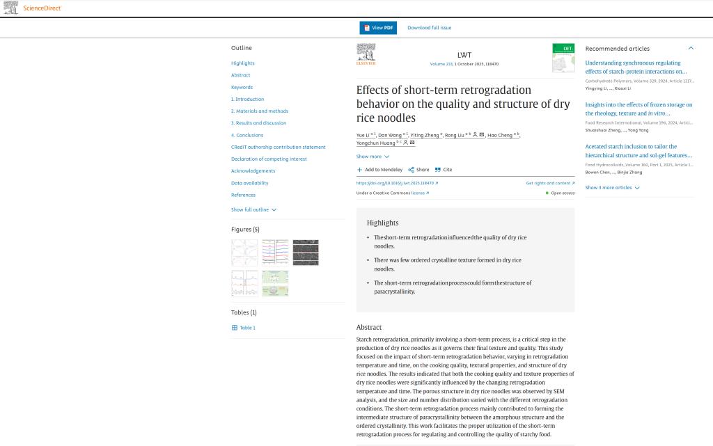 米粉加工过程的淀粉老化不同于很多食品的老化过程,其具有自身的规律和作用模式。米粉老化通常时间较短,一般只有8h左右,属于短期老化。团队在《Effects of short-term retrogradation behavior on the quality and structure of dry rice noodles》研究中,基于柳州螺蛳粉干米粉的生产实际,研究不同短期老化条件下,干米粉的品质变化和结构变化规律。不同的老化温度和时间对米粉的蒸煮品质和食用品质产生明显影响,在微观结构上表现为一定的有序化重排。米粉原料中大米淀粉及其外源性食用淀粉为高度有序的结晶结构,在糊化和机械力挤压共同作用下形成鲜湿米粉,淀粉凝胶总体上表现为无序结构,但在局部存在部分趋于有序的微晶组分。鲜湿米粉通过短期老化作用,淀粉链重排,趋向由无序向有序结构转变的过渡结构,该结构中包含一部分更加有序的次结晶结构。该研究初步揭示了米粉加工过程中淀粉短期老化的结构变化规律,为精准调控米粉品质提供理论指导。