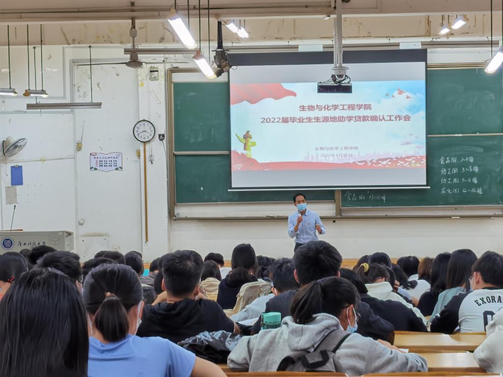 为扎实做好2022 届生源地信用助学贷款毕业生毕业确认工作,加强2022届毕业生诚信感恩教育,2022年4月15日,生化学院在四阶3教室召开学院2022届生源地信用助学贷款毕业生毕业确认会议。本次会议由学院负责资助工作的辅导员俸瑞萍老师主持,学院党委副书记、纪委书记钟兴,学院2022届全体毕业生参加会议。