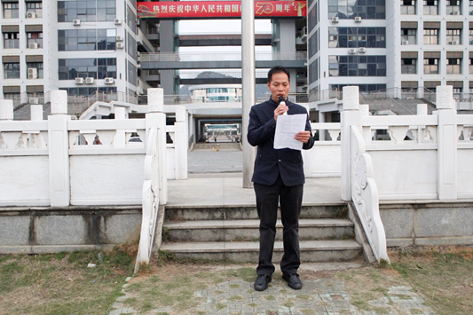 七点整,雄壮有力的《义勇军进行曲》伴随着冉冉升起的五星红旗响彻了整个校园,老师和同学们集体行注目礼,全场弥漫着一种庄严肃穆的气息。接着,为落实习近平总书记关于宪法学习宣传教育的系列重要指示精神,让同学们更好地了解和遵守宪法,钟兴老师带领全体师生在国旗下宣读宪法条例,同学们铿锵有力的宣读声在升旗台上方震耳欲聋。宪法条例宣读完毕,钟兴老师就考风考纪的问题进行了强调,并且希望同学们平时能协调好学习跟工作的关系。