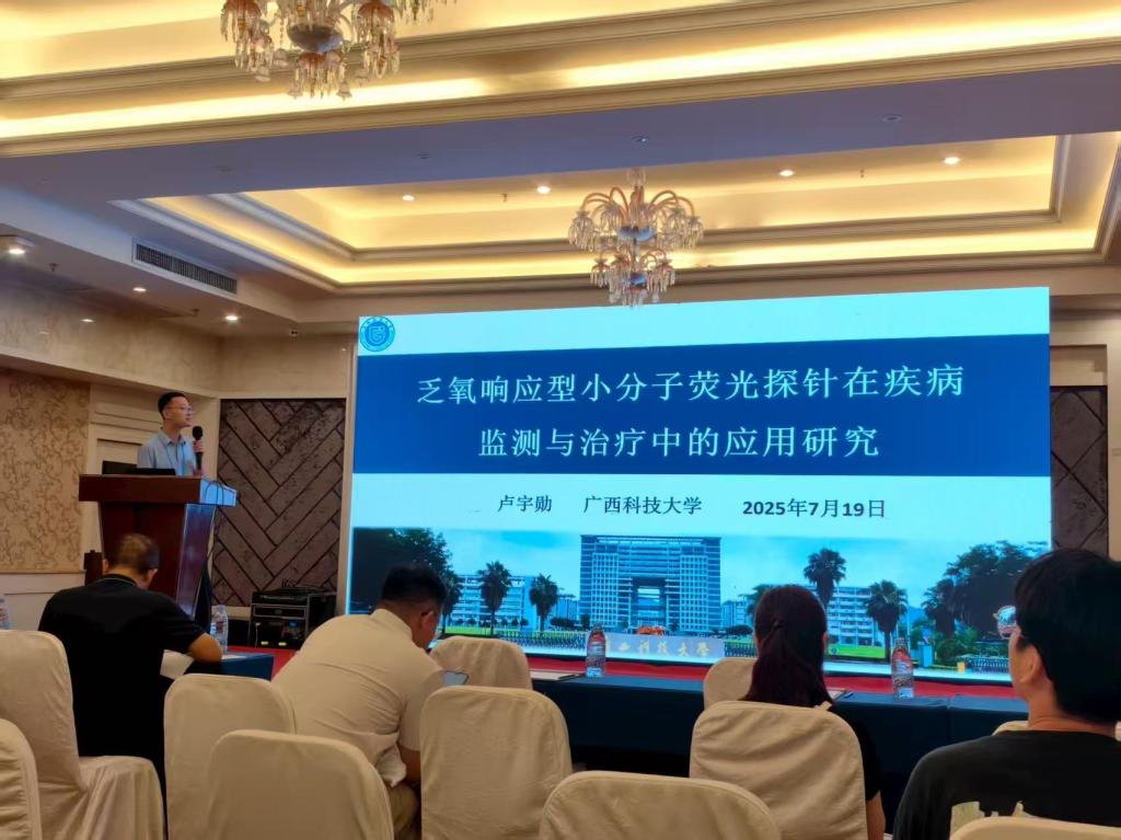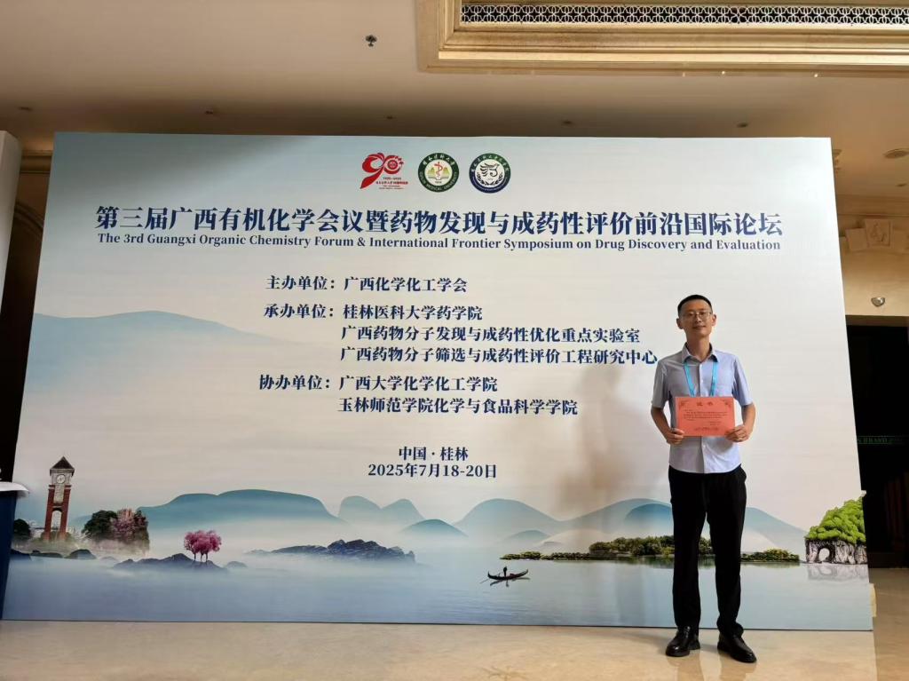 2025年7月18日20日,学院教师卢宇勋应邀前往桂林参加第三届广西有机化学会议暨药物发现与成药性评价前沿国际论坛,并在青年学者论坛上作了题为《乏氧响应型小分子荧光探针在疾病监测与治疗中的应用研究》的学术报告,展示了我院在荧光探针分子设计与疾病诊疗应用方面的前沿研究成果。此次论坛由广西化学化工学会主办,桂林医科大学药学院、广西药物分子发现与成药性优化重点实验室、广西药物分子筛选与成药性评价工程研究中心承办,广西大学化学化工学院、玉林师范学院化学与食品科学学院协办。