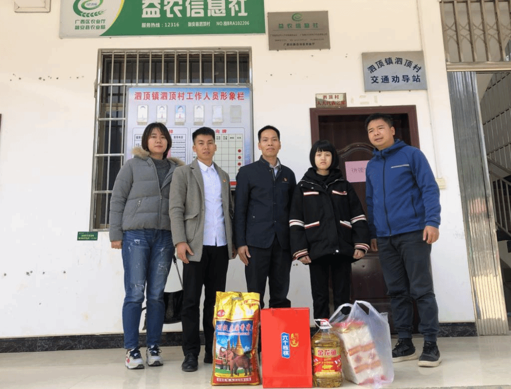 为更好地帮助贫困户精准脱贫,关爱老党员生活,12月11日,生化学院党委副书记钟兴、学生党支部书记何向、严若薇代表学院党委一行到融安县泗顶镇泗顶村开展走访慰问贫困户、老党员活动,为他们送去了食用油、牛奶和大米等生活用品。学校派驻泗顶村扶贫的驻村第一书记蒋伟昌陪同走访。