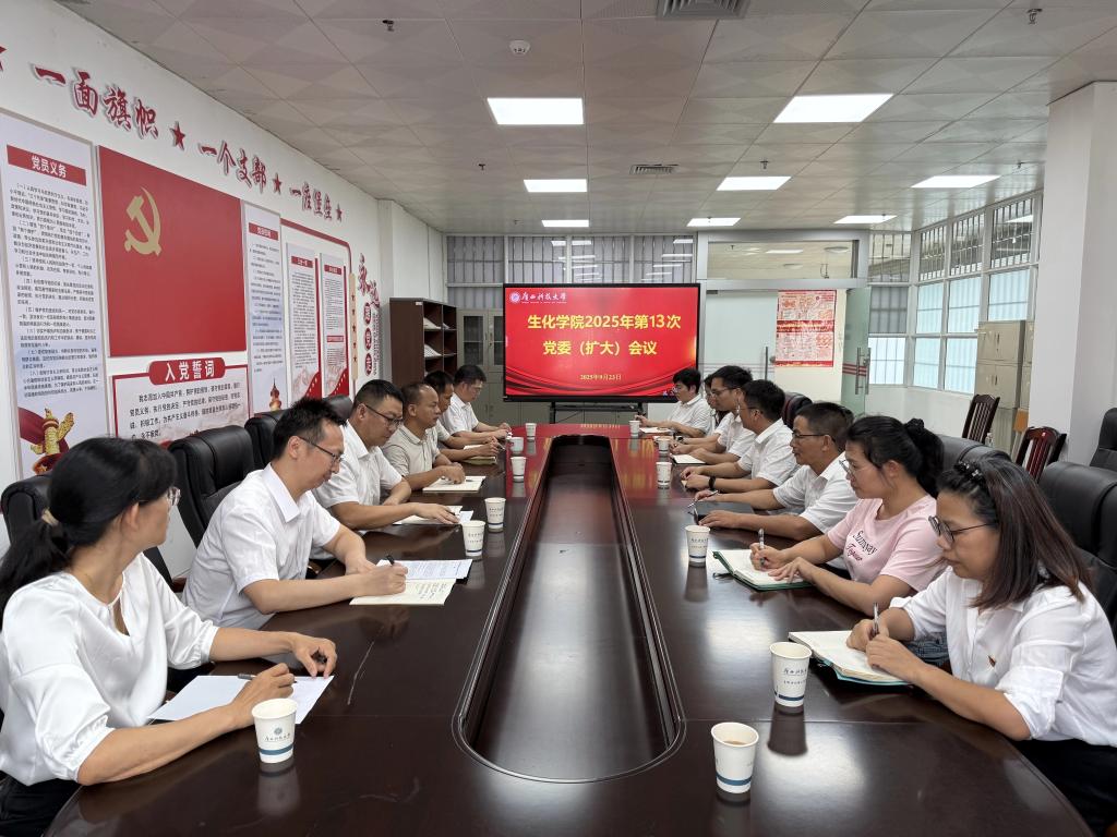 9月23日下午,生化学院在柳石校区学院306会议室召开2025年第13次党委(扩大)会议,传达学习习近平总书记关于作风建设的重要指示精神,学习贯彻中央党的建设工作领导小组会议以及自治区党委和学校党委相关会议精神,总结学院深入贯彻中央八项规定精神学习教育。学院领导班子成员、党委委员、专职组织员、党支部书记等参加会议。会议由学院党委书记陈志波主持。