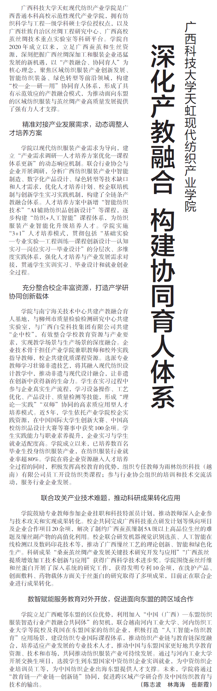 在新时代高等教育改革浪潮中,产教融合如何真正打破壁垒、赋能人才培养?近日,广西科技大学天虹现代纺织产业学院探索形成的产教深度融合、多元协同育人体系获《中国教育报》专题报道,为地方高校推动应用型人才培养提供了“广西科大方案”。