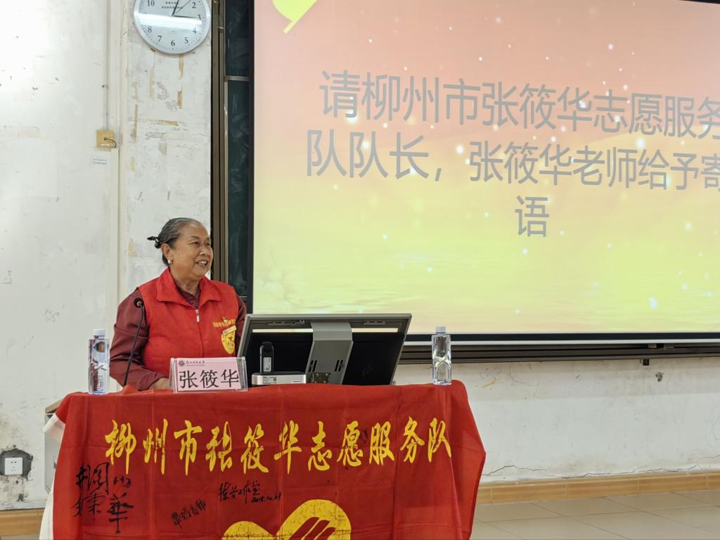 自治区道德模范、长期扎根公益一线的张筱华,结合自己多年助人为乐、扶弱济困的经历,为同学们作深情寄语。她以“自强不息、向阳而生”的人生故事勉励青年,以实际行动温暖他人,让善意成为习惯,让青春在志愿服务中闪光。