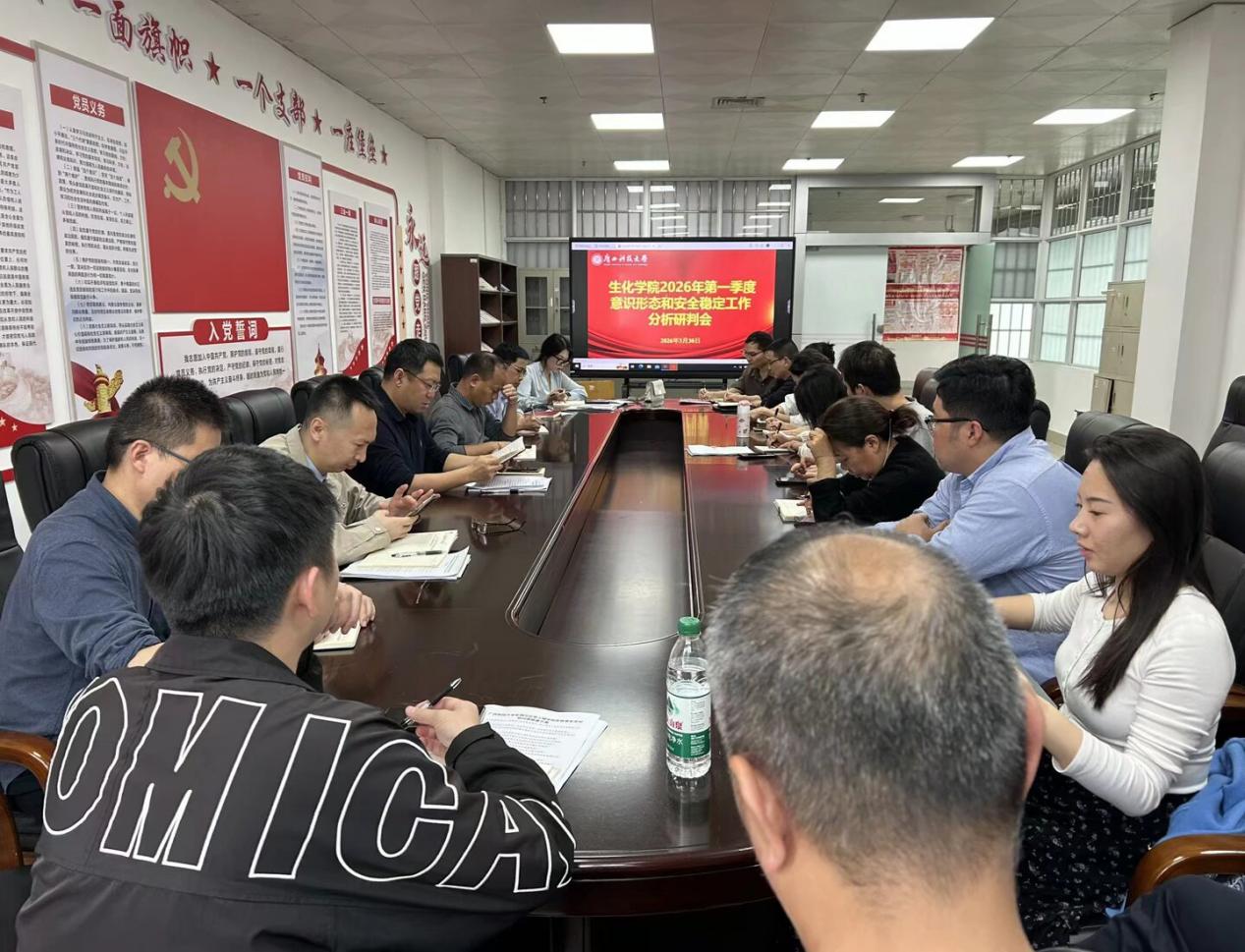 3月30日下午,生化学院在学院会议室召开2026年第一季度意识形态和安全稳定工作分析研判会。学院党政领导班子成员、各系部主任、辅导员代表及相关职能岗位人员参会,会议由学院党委书记陈志波主持。