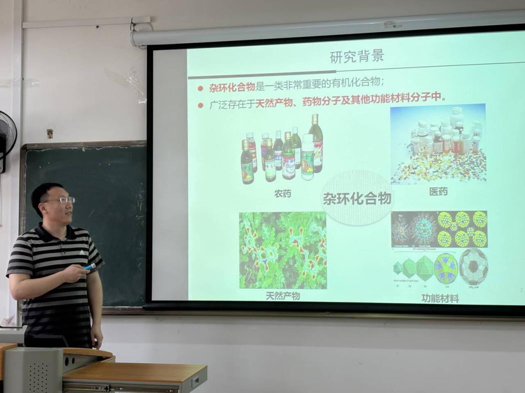 讲座中,汪煦系统梳理了异腈参与的有机合成方法学发展历程,详细阐述了钯催化异腈插入反应在构建含氮功能分子中的核心价值。他指出,有机合成方法学是创造新物质、推动科技进步的重要支撑,而异腈作为关键合成砌块,凭借其独特的反应活性,突破了传统有机化学的诸多局限,为药物化学、天然产物化学和功能材料开发提供了坚实基础。同时,汪煦结合自身研究成果,深入分析了该领域当前面临的核心挑战,包括如何实现异腈的高效高选择性有序插入、如何从简单原料完成复杂功能分子的精准合成等关键科学问题,为在场师生拓展了研究思路。