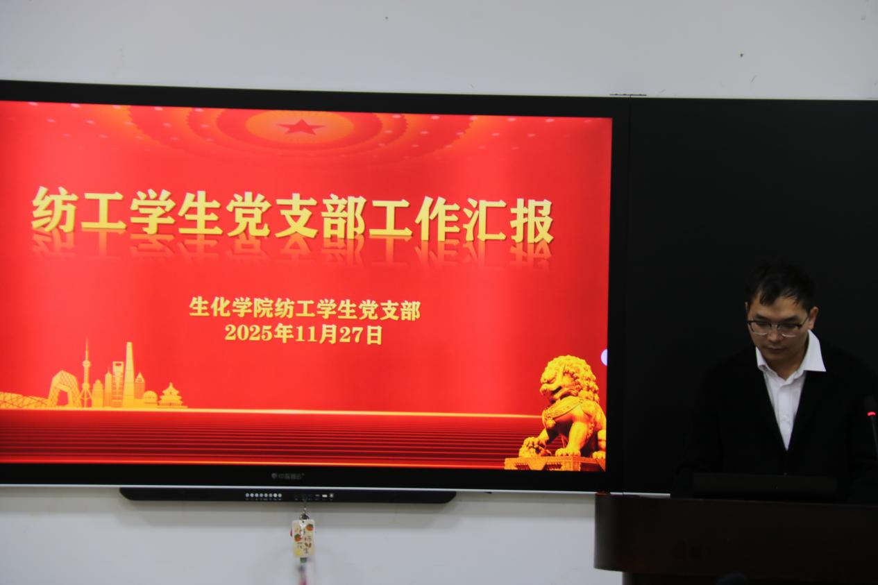 纺工学生党支部书记廖万忠首先汇报了支部“党建+”融合模式实践等工作成效。随后,生化学院教工第三党支部作为纺工学生党支部的联建支部,由党支部书记蒋芳以《服饰斑斓映华章,共铸民族共同体》为题讲授微党课,结合纺织专业特色,从民族服饰文化内涵、历史变迁、实践价值等维度,阐释了纺织技艺在促进各民族交往交流交融中的重要作用,展现了专业教育与思政教育的深度融合。