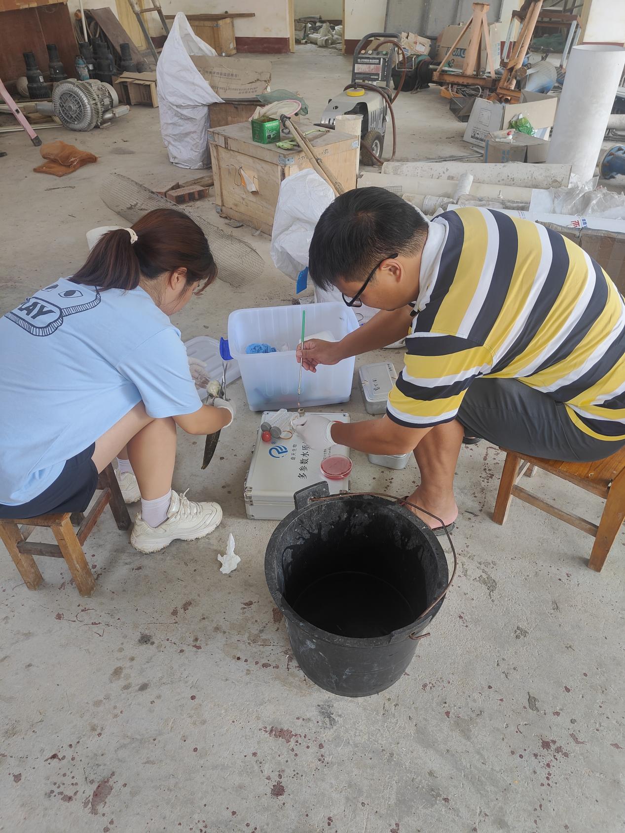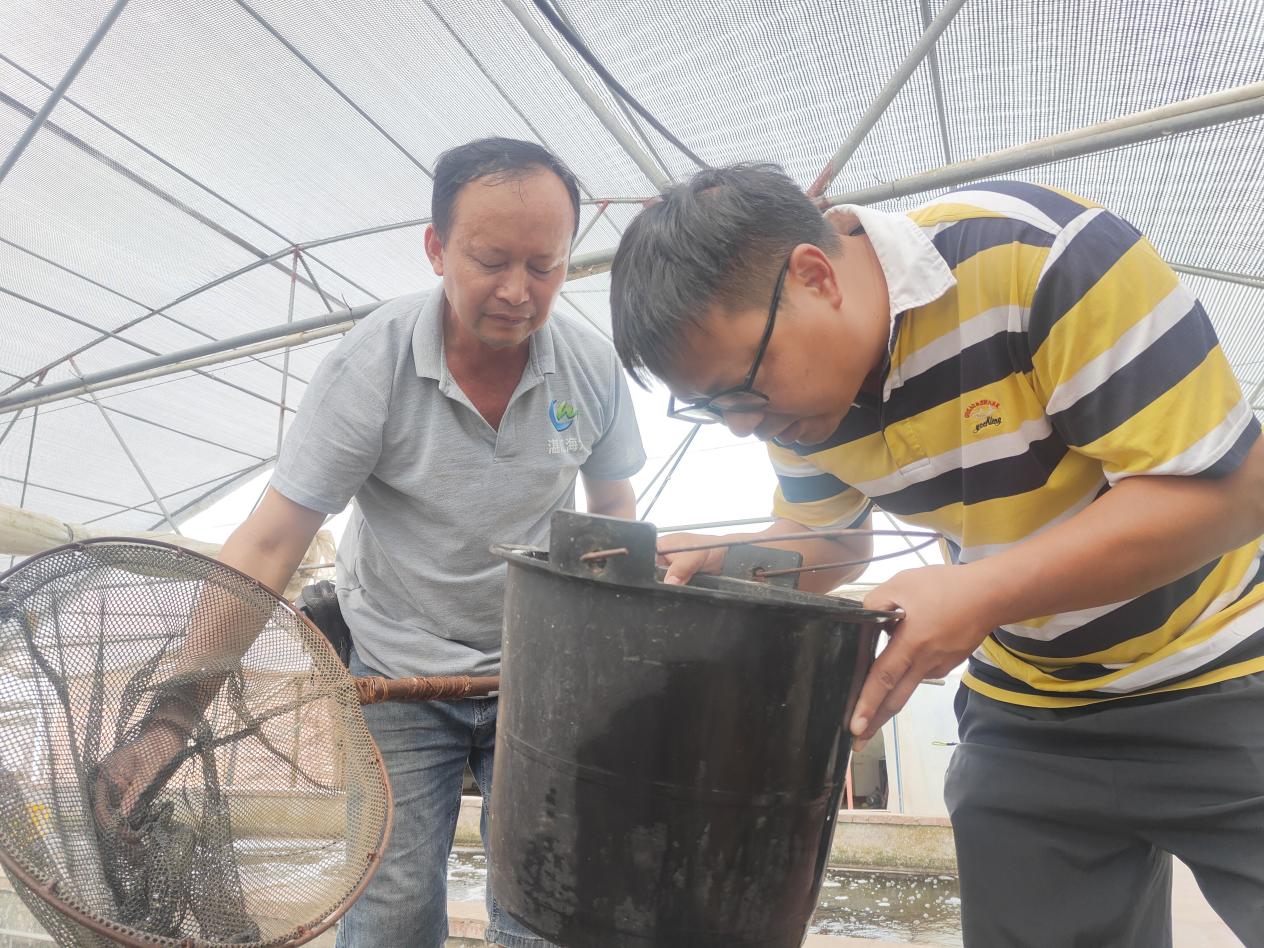 到达养殖基地后,易弋细心地与养殖户进行交谈,了解黄颡鱼发病情况。在指导养殖户进行停料、水体消毒等措施后,易弋和支部党员一起采集了病鱼样品,并带回实验室进行进一步的检测,后续检测结果出来,再根据情况进一步指导养殖户用药,更好地帮助养殖户解决当前的困难,减少养殖户的损失。