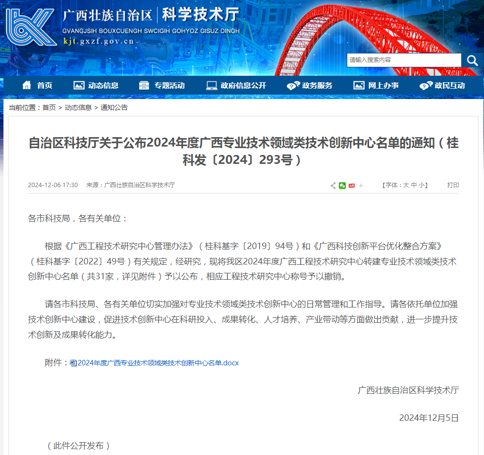 12月6日,广西壮族自治区科学技术厅印发《关于公布2024年度广西专业技术领域类技术创新中心名单的通知》(桂科高字〔2024〕293号),我校“广西柳州螺蛳粉工程技术研究中心”通过评估,成功转建为广西专业技术领域类技术创新中心,更名为“广西柳州螺蛳粉技术创新中心”。
