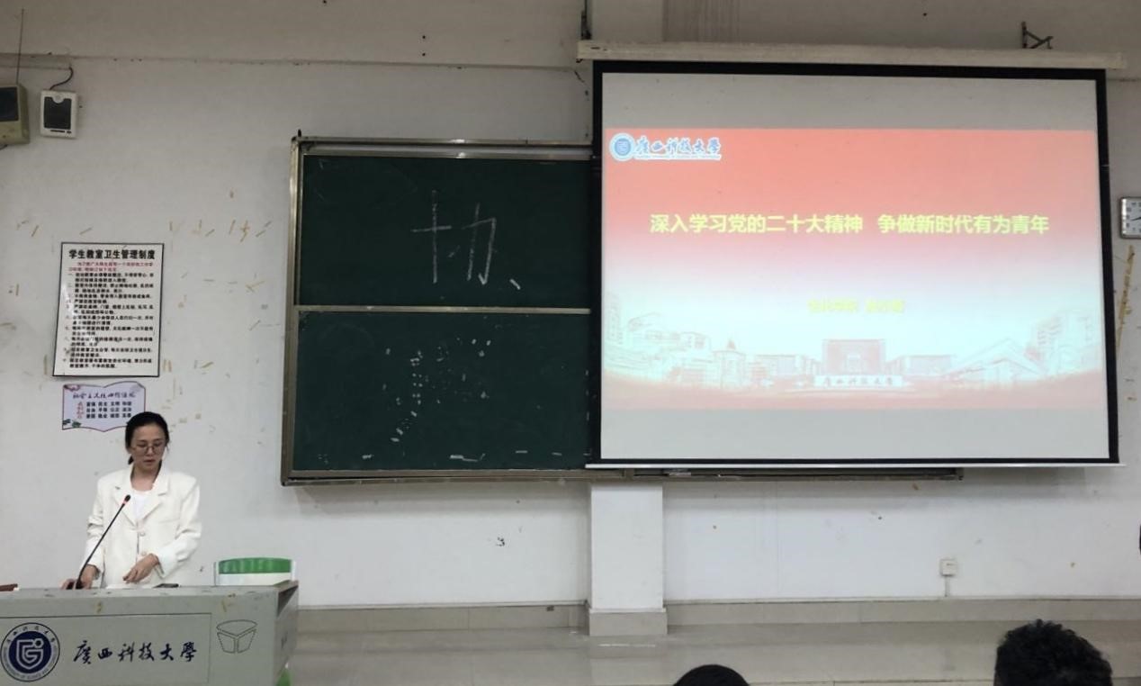 第二环节,陆小菊以“深入学习党的二十大精神,争做新时代有为青年”为主题,带领全体学生干部一起深入学习党的二十大精神、习近平总书记在学习贯彻党的二十大精神研讨班开班仪式上的重要讲话精神,以及在第十四届全国人民代表大会第一次会议上的重要讲话精神,进一步引导青年学生增强与党同心、跟党奋斗的坚定意志,以昂扬精神状态跟党走好新时代新征程。