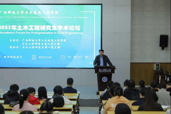 2025年11月5日下午,土建学院第一届研究生“筑创”学术论坛在图书馆报告厅顺利举办。学院院长邓宇致开幕词,他指出,论坛旨在为研究生搭建高水平的学术交流平台,激发创新思维。