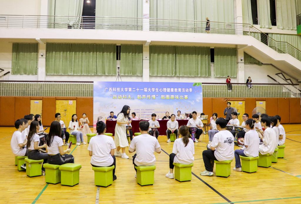 为提升我校大学生心理健康素养,将心育与美育相融合,6月17日,我校在文昌校区体育馆举行“跃动科大,鼓声传情”鼓圈趣味比赛。此次比赛由学校学生心理健康中心主办,土木建筑工程学院、人文艺术与设计学院承办。来自各学院(部)的31支参赛队伍共600多人参加了比赛。由学校心理中心鼓圈团队指导老师担任比赛评委。赛前,土建学院党委副书记、纪委书记谭璐致辞,她介绍了鼓圈活动的心理效用,鼓励同学们通过音乐增强人际互动与自我表达能力,提高社交主动性和社交技能。
