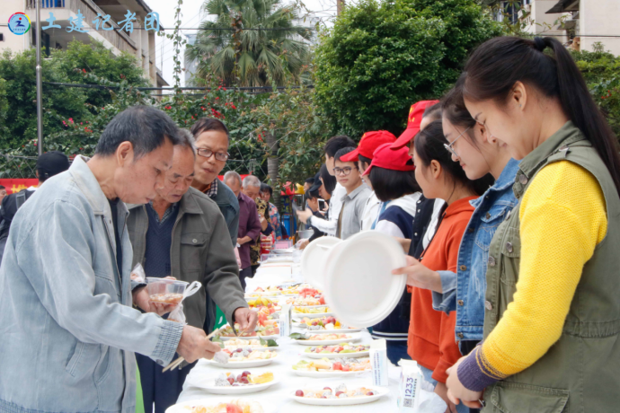 接着,活动正式开始。志愿者在负责人的安排下开始进行自己的工作,维持秩序的志愿者一字排开,整齐划一。另一旁,则是忙着制作水果沙拉的志愿者们,她们用自己灵巧的双手制作出一盘盘精美的沙拉。与此同时,活动现场还安排了社区节目表演,欢歌笑语中让人感受到了人与人之间的温暖,也向大家展现了别样的社区文化。节目表演结束后,志愿者积极地协助工作人员,为社区老人提供美食。他们认真负责的态度受到了大家的好评,最后大家一起合影留念。
