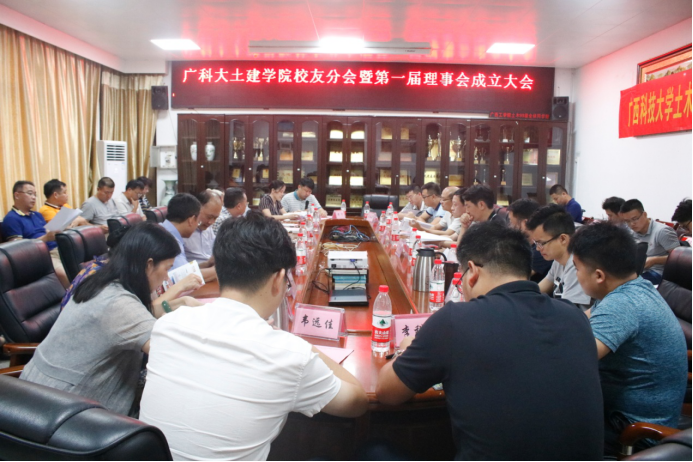 会议开始,观看学校宣传片,使校友们对学校目前发展有了更详细的了解;接着,与会校友举手表决通过了《广西科技大学土木建筑工程学院校友分会章程(征求意见稿)》、《土木建筑工程学院校友分会第一届理事会名单和负责人建议名单》。推选原土建系主任黄任常当选名誉会长;1985级校友广西公物拍卖行有限公司董事长曾飙当选会长;校友莫仲涛、李日新、夏家桂、于峰、林芳福当选副会长;土建学院党委副书记邓宇当选秘书长;接着,与会领导为第一届理事会成员颁发聘书,并为土建学院校友分会颁发牌匾。