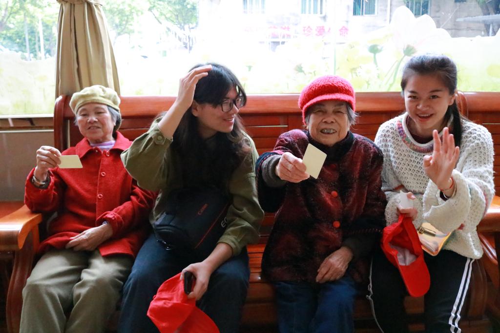 走进老人院,负责人杨焕芳给各位志愿者分发写满了同学们对老人的祝福小卡片。志愿者们将卡片送给老人,陪老人聊天,倾听老人讲述年轻时的故事。还有的同学陪伴老人做活动,为他们打扫清洁卫生等。老人们用柳州话聊起了家常,会柳州话的志愿者热心地当起了翻译;有的老人一时兴起,还唱起了歌:“北京的金山上……哎哟,我不会唱了”,逗得大家哈哈大笑,老人们露出欢快的笑容。看到老人们灿烂的笑脸,听到老人们爽朗的笑声,简单的陪伴,使志愿者们充分体会到了本次活动的意义所在——尊老爱幼,陪伴最简单,但是陪伴也最幸福。
