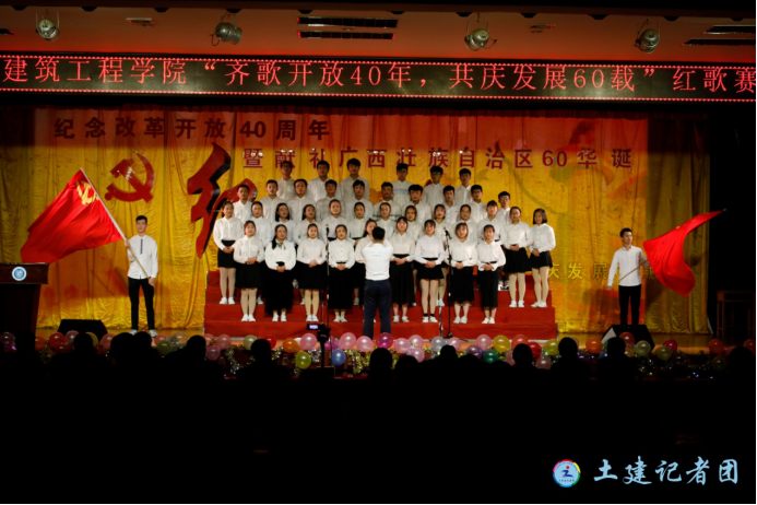 为庆祝改革开放40年,庆祝广西壮族自治区成立60年,12月20日晚,土木建筑工程学院在大学生活动中心开展了主题为“齐歌改革开放40年,共庆壮乡发展60载”的红歌比赛。土建学院党委书记杨南,党委副书记副院长邓宇,团委书记辛姣珍,学生党支部书记刘显晖、苏柳月、张哲源、周红梅、梁郁、翟滢莹老师,学生党支部全体成员参加了活动。