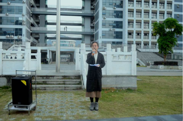 仪式完毕,来自土木163班的田金鑫进行国旗下讲话。她作了主题为“迎六十大庆,展文明风采,创文明校园”的演讲,对广西即将到来的六十周年庆表达了由衷的祝福,并向同学们提出建设文明校园的倡议,呼吁同学们文明礼仪、文明用餐、文明用网。