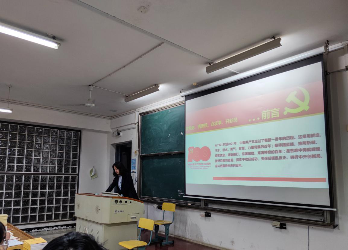 明亮又宽敞的教室里,梁书记在讲台上说着,党支部的同志们在讲台下听着。梁老师提前备好了党史学习教育的课件,她先是向大家详细介绍了中国共产党的四个历史时期,并分别阐述了各个历史时期都有哪些标志性的历史事件,点明各历史事件的重要意义,然后又解析了习近平总书记系列重要讲话中蕴含的优秀精神,最后向大家说明了每日进行学习强国的注意事项。此次活动共用时一个小时,党支部的成员们都认认真真地用笔在专门的本子里记下了各自的收获。
