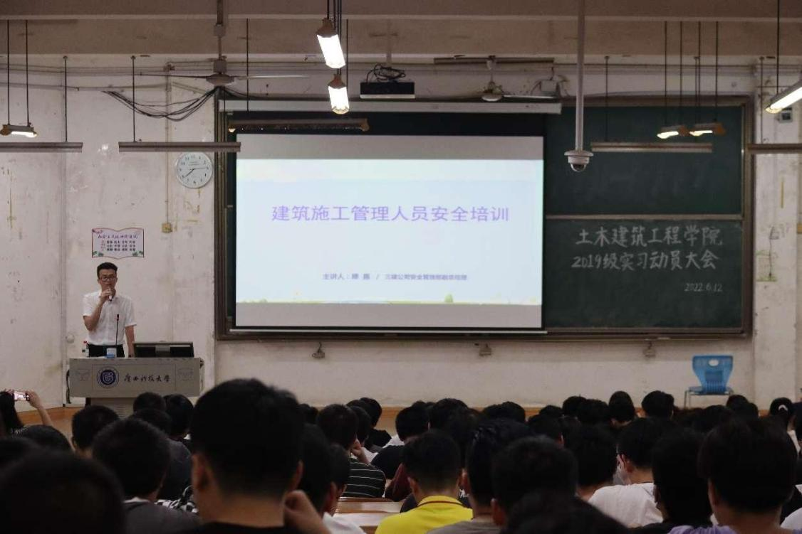 专业生产实习的安全教育培训由广西三建安全管理部副总经理滕昌宣讲。滕经理为学生们讲解了建筑行业特点及安全的重要性、法律法规及企业安全管理制度以及安全生产注意事项,培训学生辨识事故隐患的能力。