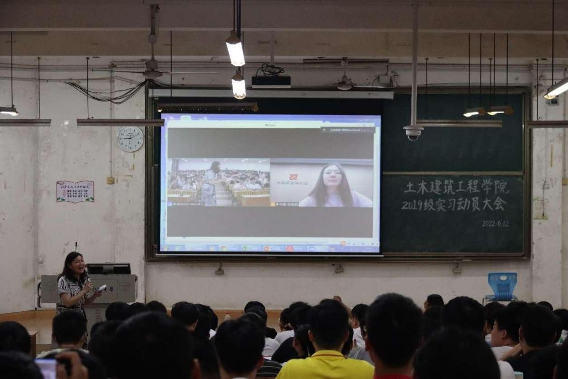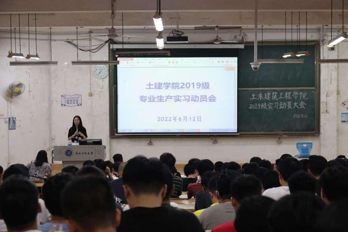 2022年6月12日晚,土建学院2019级专业生产实习动员会在四阶一举行。出席动员会的有中量工程咨询有限公司人力资源部长林晓君,教学副院长黄柳云,工程造价教研室主任黄湘红,工程管理教研室主任郭亮、副主任韦玉柳及土木工程、工程管理、工程造价2019级的学生。动员会由年级主任苏柳月主持。