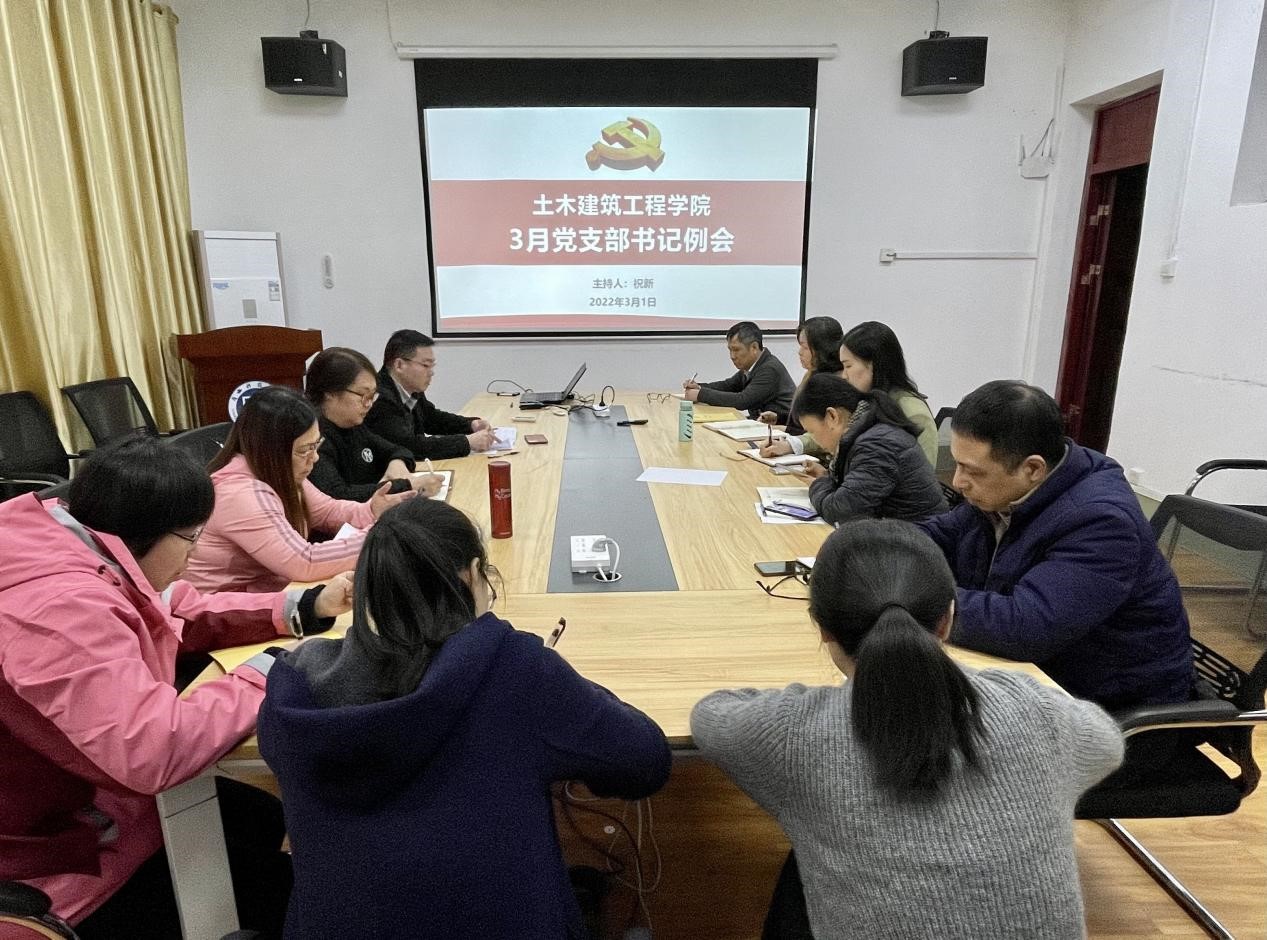 3月1日下午,土建学院在建工楼406会议室召开党支部书记工作会议,党委书记祝新、党委副书记纪、委书记谭璐、专职组织员梁小延及全体党支部书记参加会议。会议由祝新主持