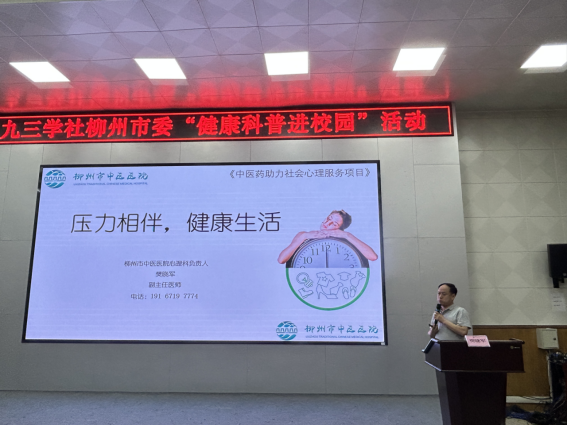 活动开始,九三学社柳州市委副主委、市中医医院副院长吴刚致辞,他指出九三学社柳州市委通过开展“健康科普进校园”公益活动,目的是向学校师生宣传健康生活理念及自我保健方法,让广大师生在工作、学习之余能合理安排休息,享受健康生活,营造“平安校园,健康为本”的良好学习工作氛围。随后,柳州市中医院副主任医生樊晓军作了题为《压力相伴,健康生活》的心理健康知识讲座,他详细讲解了压力是什么、压力对人的影响、面对压力我们怎么办,并为学生们提出的心理健康问题进行了解答。讲座结束后,樊晓军还为在场师生提供了心理咨询、心理测试等义诊服务。