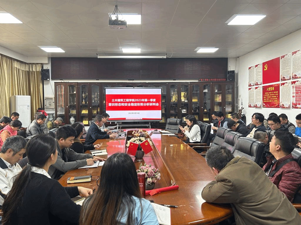 3月14日下午,土建学院在建工楼302会议室召开2023年第一季度意识形态和安全稳定形势分析研判会。学院领导班子、全体教职工参加会议。会议由学院党委书记祝新主持。