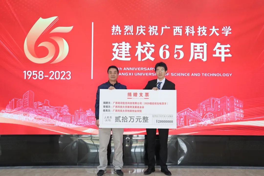 此次哈泽洋向学校捐赠20万元,体现了他对学校的深厚感情,更体现了他强烈的社会责任感。他以实际行动践行“敢为人先、百折不挠,务实创新、追求卓越”的广西科大精神,是同学们学习的榜样。