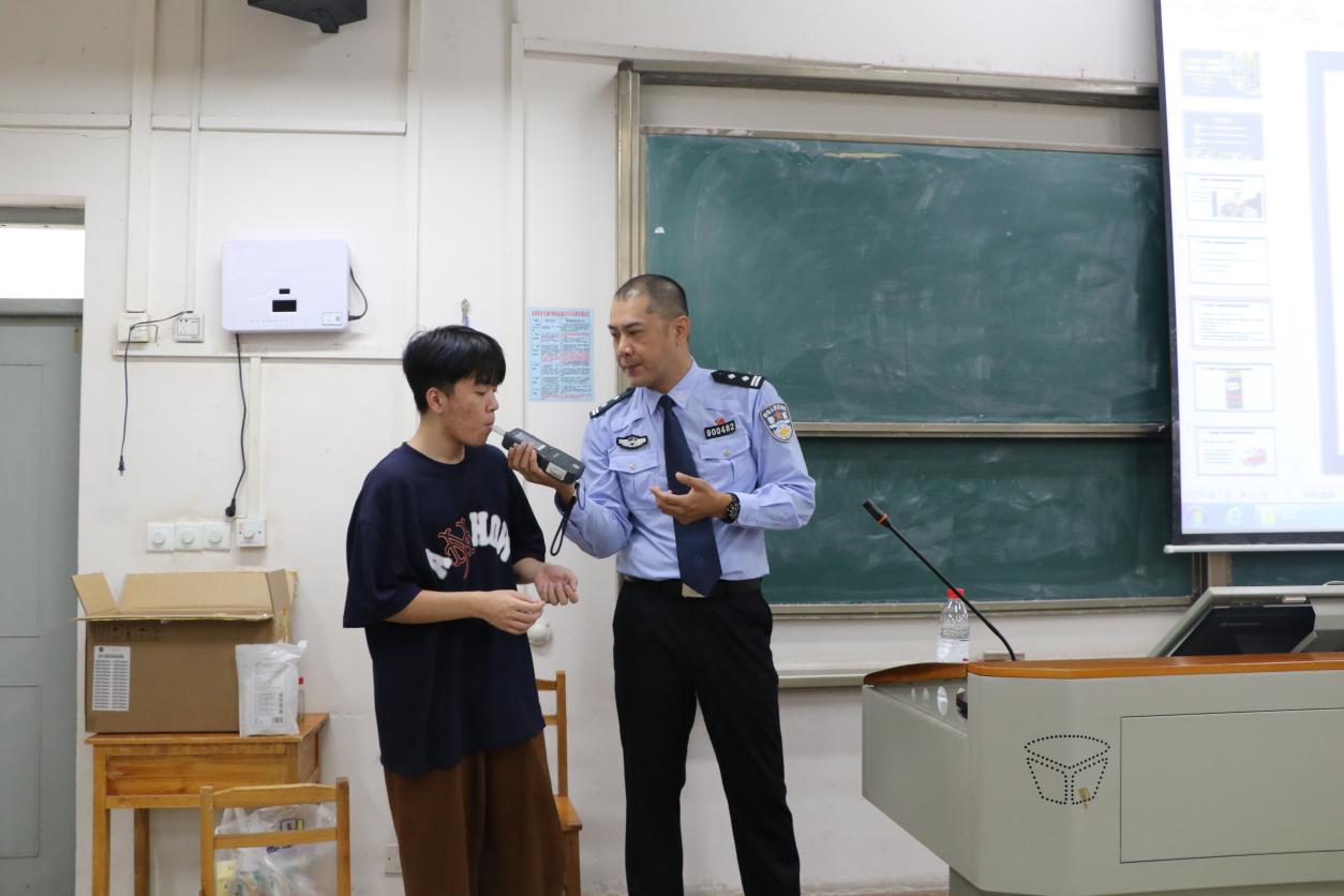 蓝啸海中队长带领宣传小组为我院师生做主题宣讲活动,活动分为交通安全知识讲解、有奖互动问答、酒驾检测三个环节。